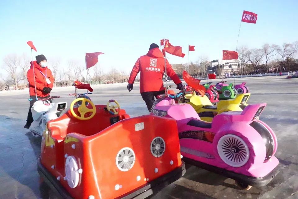 什刹海冰场负责人杨谦介绍,今年的什刹海冰场开放前海和后海两块区域,总经营面积为16万平方米。其中,前海全部区域及后海的东侧区域为综合区,为游客提供单人冰车、双人冰车、冰上自行车等娱乐设施,后海西侧区域为速滑区,提供冰鞋供游客游玩。