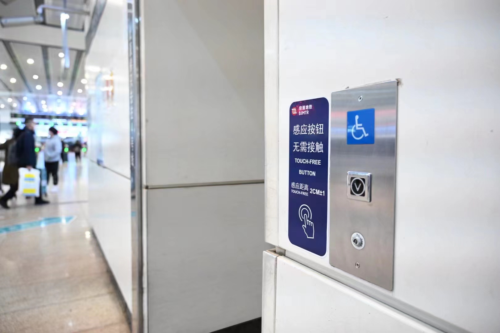 地铁4号线北京南站可换乘地铁14号线,是高铁北京南站的接驳站,是北京轨道交通路网中的大客流车站。为保障乘客安全、顺畅出行,京港地铁经过充分调研,率先在4号线北京南站站厅层到站台层直梯,试点应用免接触按钮,乘客乘坐直梯时,该按钮无需触碰即可控制电梯运行,让乘客使用更便捷,帮助携带大件行李、老年及轮椅乘客轻松乘梯,进一步提升乘客出行体验。