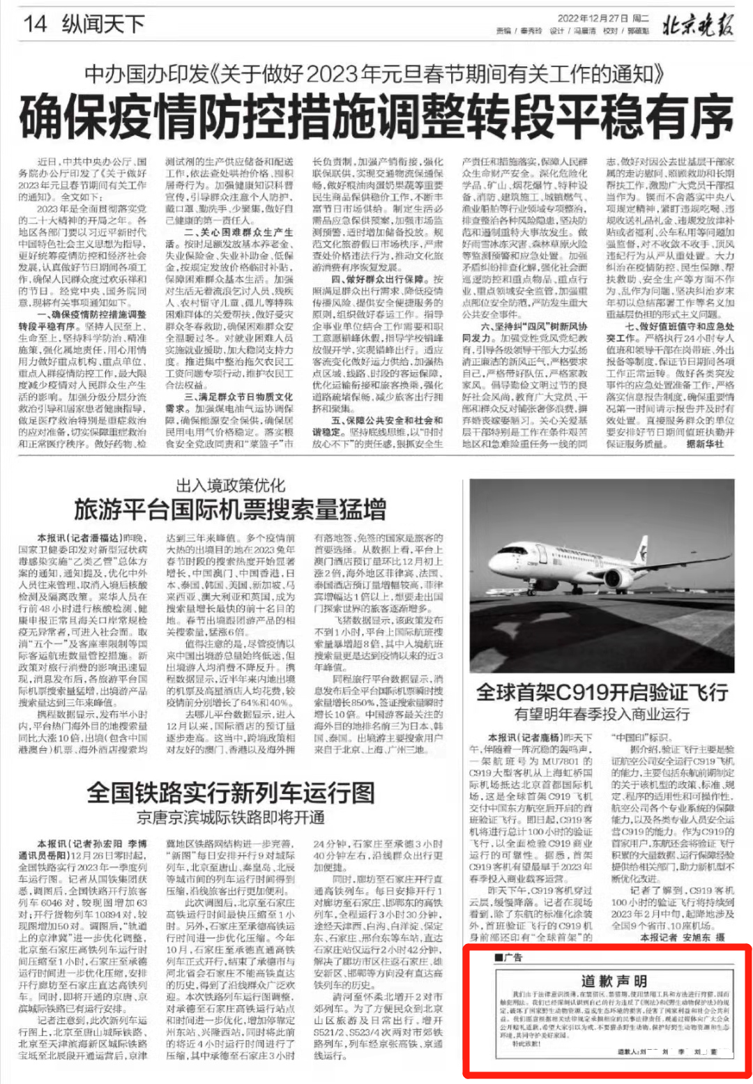 12月27日,《北京晚报》在第14版刊登了五被告人的道歉声明。