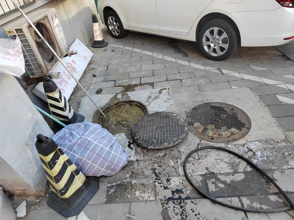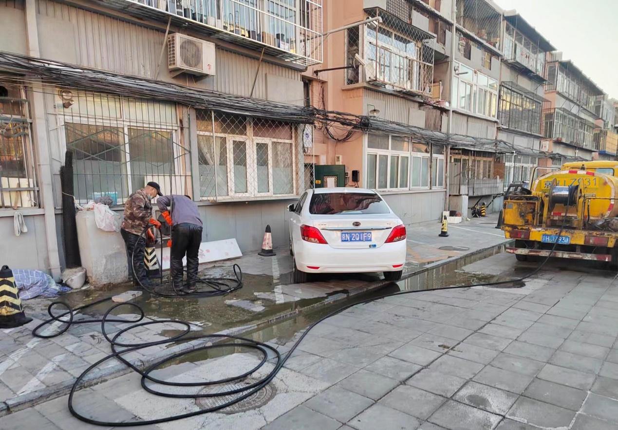 第二天,阜外东社区会同社区物业,与污水井疏通工人共同抵达现场进行管道疏通工作,工作人员先后凿开了5个污水井,都没找到管道末端,为尽快解决堵塞问题,施工人员在满冒的污水井直接疏通,疏通过程中不断有污水冒出,给施工增添了难度,他们排除各种困难,经过3个多小时的紧张工作,污水井阻塞问题终于得到解决。