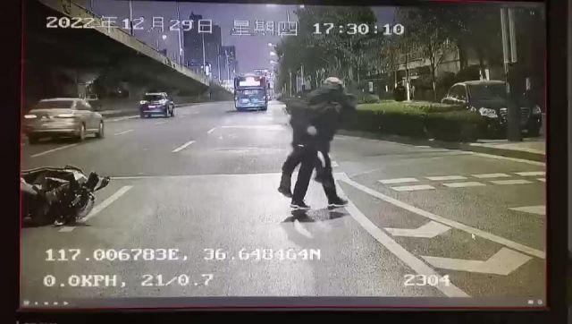 2022年12月29日,济南公交K15路驾驶员张华楠驾驶车辆行驶到玉函立交桥路口转弯西行时,发现路中间倒着一辆摩托车骑车人也倒在地上。张师傅立即停车,将车辆安全停放后下车走到摔伤市民跟前问询。