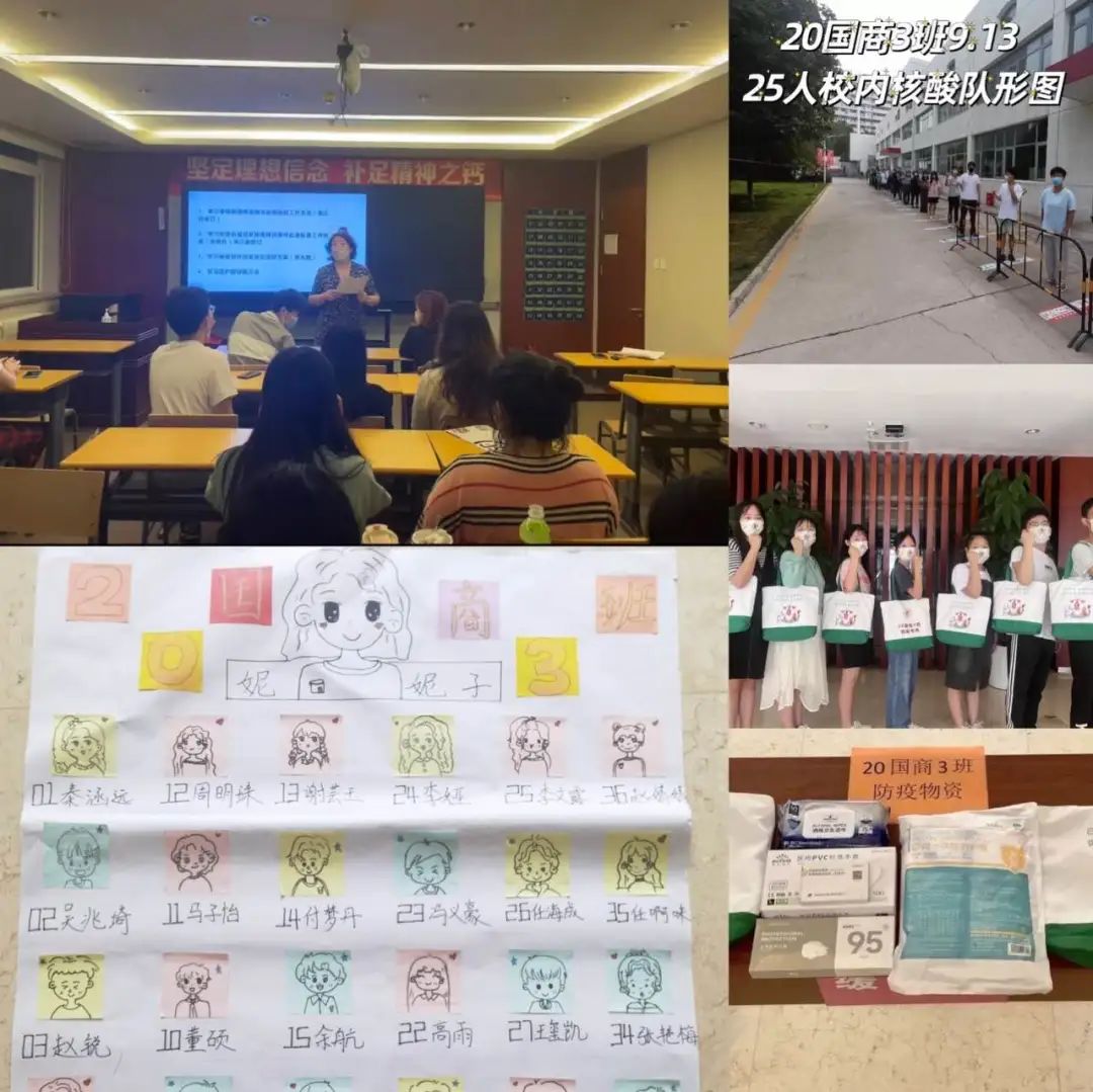 2020级国商3班班主任杨妮表示:“按照学院要求,自新学期开始以来,20国商3班从点滴做起,持续做好疫情防控工作,召开防疫主题班会、手绘位置图、核酸队形合影等线上线下活动,积极开展防疫宣传和教育。我还为学生们准备了漂亮的班级专属防疫背包,里面放了防护服、N95口罩、医用手套、酒精湿巾等等物品,各宿舍将防疫背包挂于固定地点以备取用,生活委员负责把全班的应急物资带到教室,保障突发情况时,同学们心中不慌,第一时间做好自身防护。”