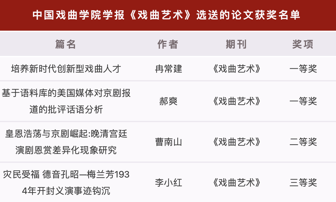 近日,由上海戏剧学院、全国戏剧期刊联盟、田汉戏剧奖组委会和广东省艺术研究所联合主办的第36届田汉戏剧奖评选揭晓,我院四名教师荣获理论奖。其中,冉常建的论文《培养新时代创新型戏曲人才》和郝爽的论文《基于语料库的美国媒体对京剧报道的批评话语分析》获得一等奖,于建刚的论文《对京剧传播的当代思考》获得二等奖,李小红的论文《灾民受福 德音孔昭—梅兰芳1934年开封义演事迹钩沉》获得三等奖。