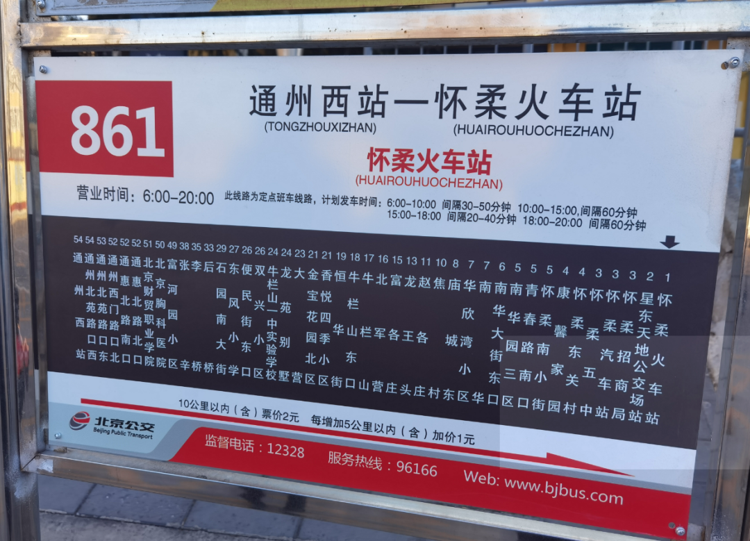 怀柔火车站、星东天地公交场站、怀柔招商局、怀柔汽车站、怀柔五中、怀柔东关村、康馨家园、怀柔南小街、青春路南口、南华园三区、南华大街东口、南华、华欣湾小区、庙城东、焦村、赵各庄、龙王头、富各庄、北军营、牛栏山、牛栏山东口、恒华街、香悦四季小区、金宝花园北区、大营、龙苑别墅、牛栏山一中实验学校、双兴小区、便民街东口、东风小学、石园南大街、后桥、李桥、张辛、富河园小区、北京胸科医院、北京财贸职业学院、通惠北路北口、通惠北路南口、通州西门路口北、通州北苑路口东、通州北苑路口西、通州西站。