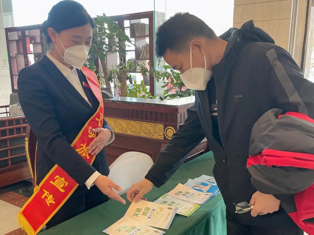 北京凤凰台饭店积极组织开展“文明旅游伴随您”主题宣传活动,活动现场饭店文明旅游大使向游客发放《文明旅游》宣传册,并介绍文明旅游的相关知识和内容。提醒游客在旅途中遵守文明规范,共创文明旅游氛围。