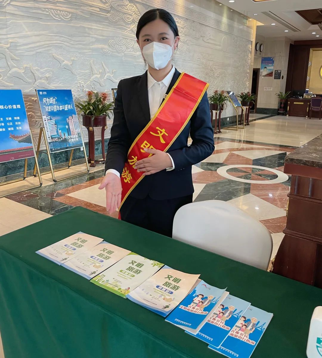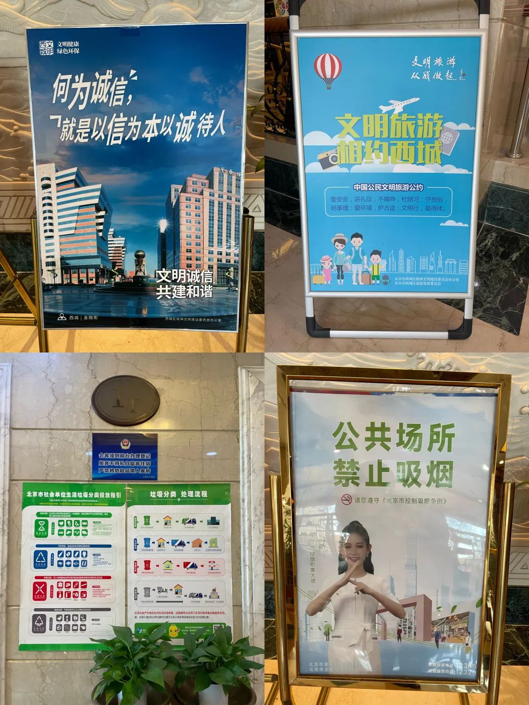 饭店大堂区域张贴“文明旅游”宣传海报,向游客倡导文明旅游、安全旅游、环保旅游的理念,营造活动良好氛围。
