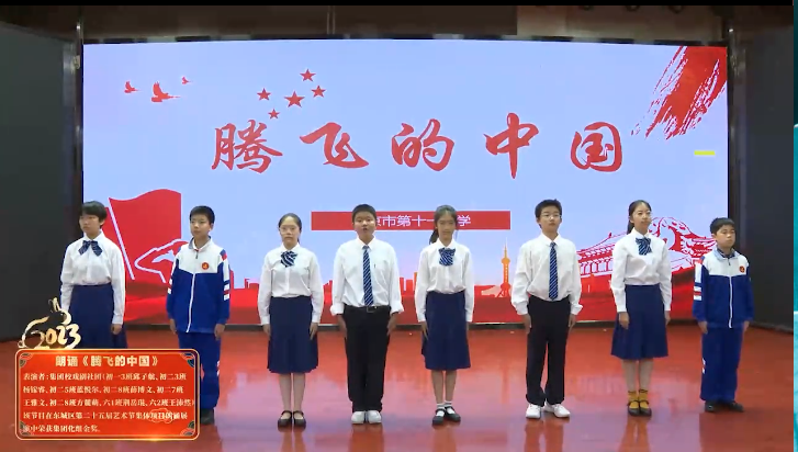 朗诵《腾飞的中国》 初中戏剧社团 初一3班邱子航、初二3班杨镓睿、初二5班蓝悦尔、初二8班薛博文、初二7班王雅文、初二8班方麓萌、六(1)班荆岳琨、六(2)班王沛然