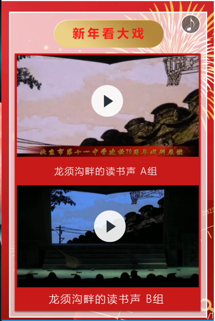 在新年盛典播放的同时,开通新年大戏观看通道,学校经典剧目《龙须沟畔的读书声》再次激发师生的爱国情、爱校情,度过一个文化新年。