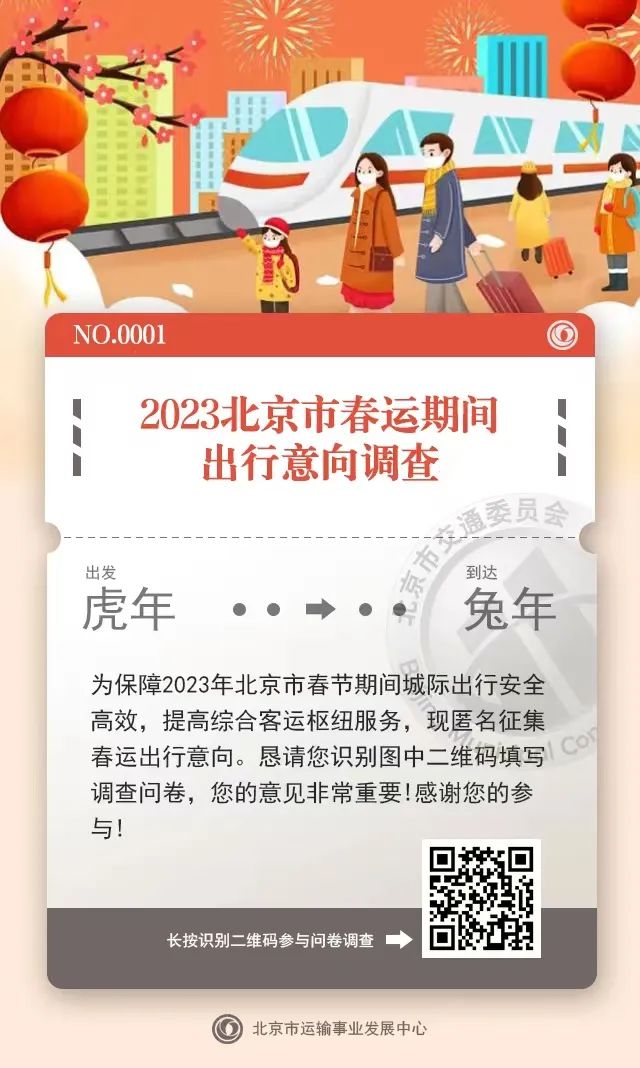 为保障2023年北京市春节期间城际出行安全高效,提高综合客运枢纽服务,现向在京市民征求春运出行意向匿名调查。恳请您扫描问卷二维码反馈您的意向,您的意见非常重要!感谢您的参与!