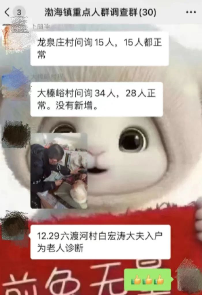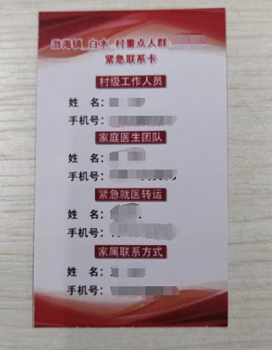 渤海镇实行1名村干部、1名家庭医生、1名家属的“三包一”管理机制,将详细情况上报镇专班统一汇总,对重点人员无微信的情况,镇级统一制作印有村级工作人员、家庭医生、紧急转运人等信息的紧急联系卡,确保第一时间掌握基本状况;同时镇社保所安排专人对接镇域内3家敬老院,每日了解院内老人情况。同时,每个村都有一辆指定的爱心转运车辆。
