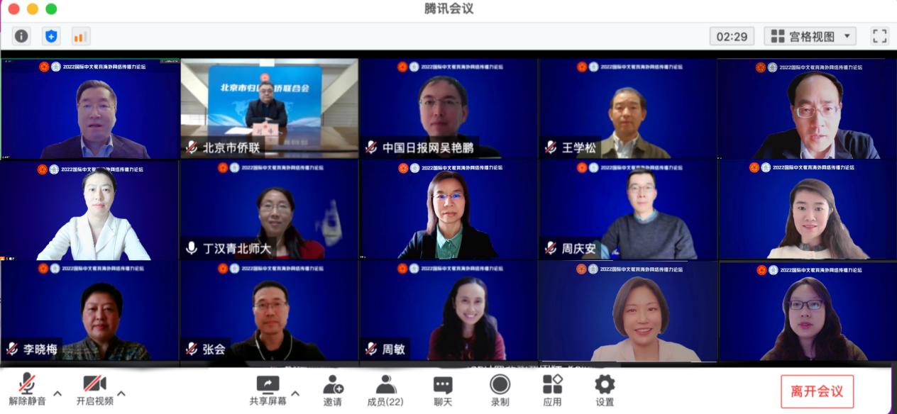 周亭表示国际中文教育海外传播需要更新传播观念、培育多元主体,拓宽发声渠道,扩大传播声量,关注舆论走向,重视形象建设,提升公众的好感度;冯丽萍表示,国际中文教育要“精准传播”,针对不同的群体采用精准传播其需要的,能接受的内容;张会提出国际中文教育要创新思维,孔子学院应该加大数字化建设力度,通过网络传播影响力来实现创新发展。李晓梅表示,国际中文教育要与区块链资源平台相结合,实现共享、共建和信息化管理;褚峻重点介绍了瑞士华文教育基金会在国际中文教育发展过程中所发挥的重要作用;苏鸿雁介绍了全德中文学校联合总会与德国华达中文学校在中文教育海外传播方面探索性的实践;钟诚表示国际中文教育要“在线化、个性化、家园化”,进一步促进国际中文教育助推中国文化走向世界。