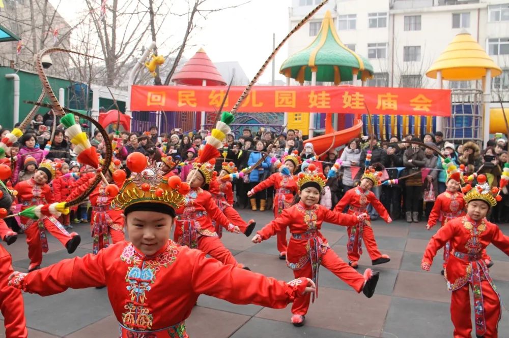 挖掘民族传统节日的价值,发挥其激发孩子好奇、引领孩子触碰、陪伴孩子成长的作用——将枯燥难懂的“文化”元素转化为幼儿可以接纳的内容,进一步打磨承载这些内容的途径,才能使教育落实。像贯穿人文主题联动家园社区的“娃娃庙会”是园所独具民族特色的标志性活动,目前已连续召开多届。从庙会的筹备到正月十五开锣将近两个月的时间里,孩子们与家人共同策划活动主题、选择每个班组将要开展的活动内容、共同收集材料……并且,邀请家人们来到幼儿园亲身参与手工制作活动,泥塑孙悟空、虎头鞋和兔爷、剪纸窗花、水墨制作团扇等都是孩子们和家长的最爱。孩子们筹办庙会,体现出了他们对民族传统文化的理解,也再现了对民族艺术的认知。