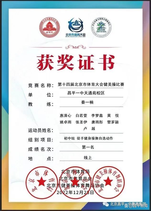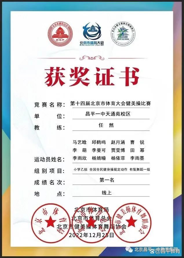 昌平一中天通苑校区健美操社团以线上形式参加了由国家体育总局北京市健美操体育舞蹈协会举办的第十四届体育大会健美操比赛,小学组和初中组在比赛中均获得冠军!