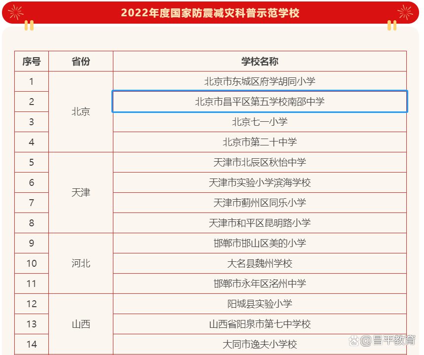 近日,中国地震局公布了2022年度国家防震减灾科普教育基地和示范学校认定工作,全国共认定97所学校为2022年度国家防震减灾科普示范学校,北京市4所学校入选,昌平区第五学校南邵中学位列其中。