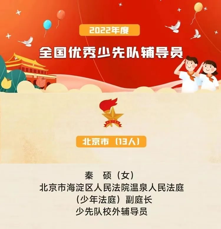 近日,共青团中央、教育部、全国少工委发布《关于表彰2022年度全国优秀少先队员、全国优秀少先队辅导员、全国优秀少先队集体的决定》。其中,海淀法院温泉人民法庭(少年法庭)副庭长秦硕被评为2022年度全国优秀少先队辅导员。