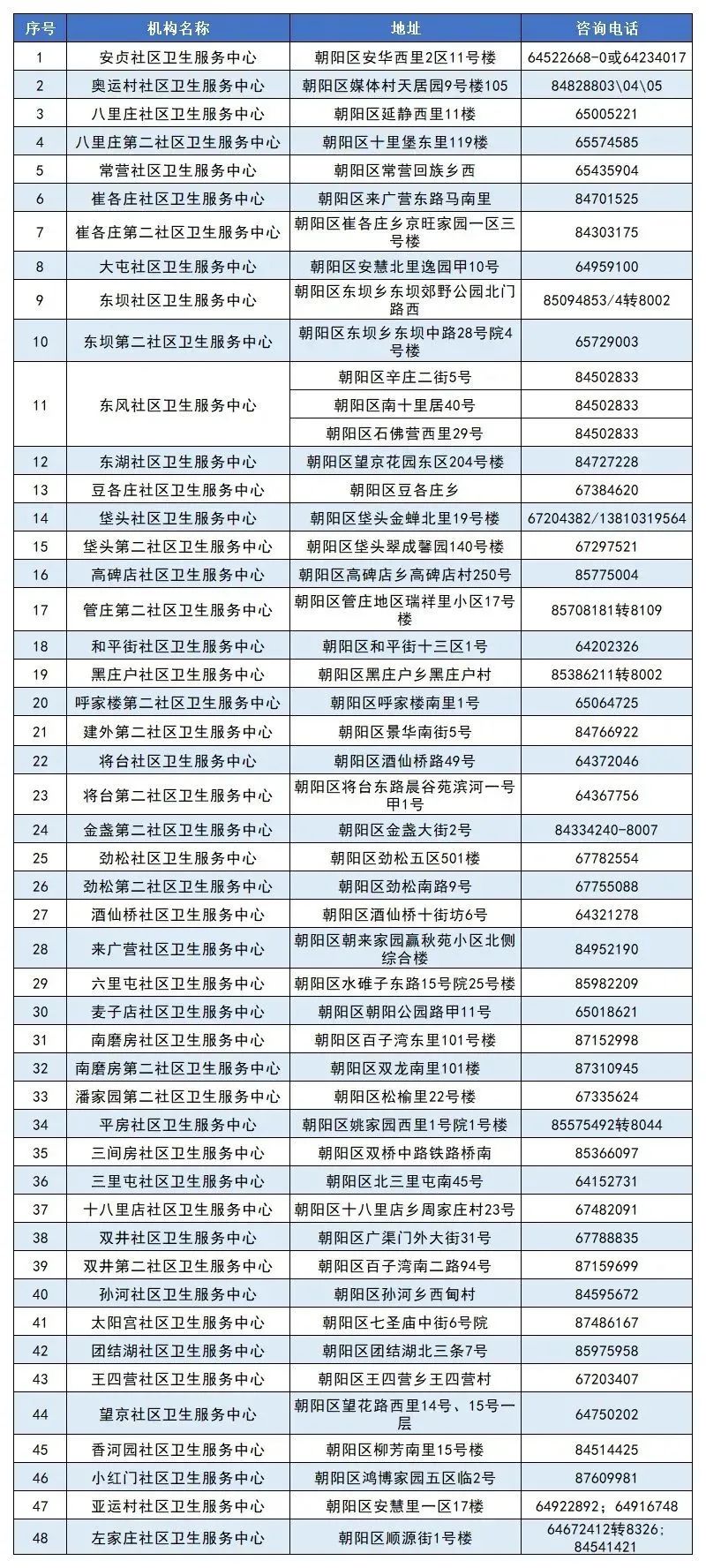 安贞社区卫生服务中心、大屯社区卫生服务中心、麦子店社区卫生服务中心、孙河社区卫生服务中心、太阳宫社区卫生服务中心、香河园社区卫生服务中心、八里庄社区卫生服务中心、小红门社区卫生服务中心、三里屯社区卫生服务中心、崔各庄第二社区卫生服务中心、亚运村社区卫生服务中心