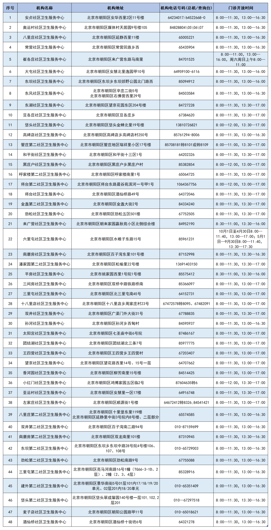 太阳宫社区卫生服务中心、香河园社区卫生服务中心、六里屯社区卫生服务中心、崔各庄社区卫生服务中心