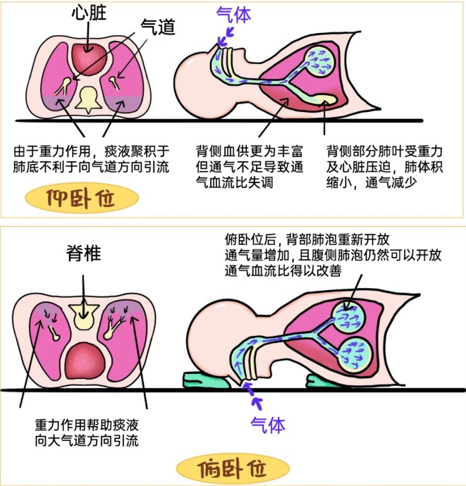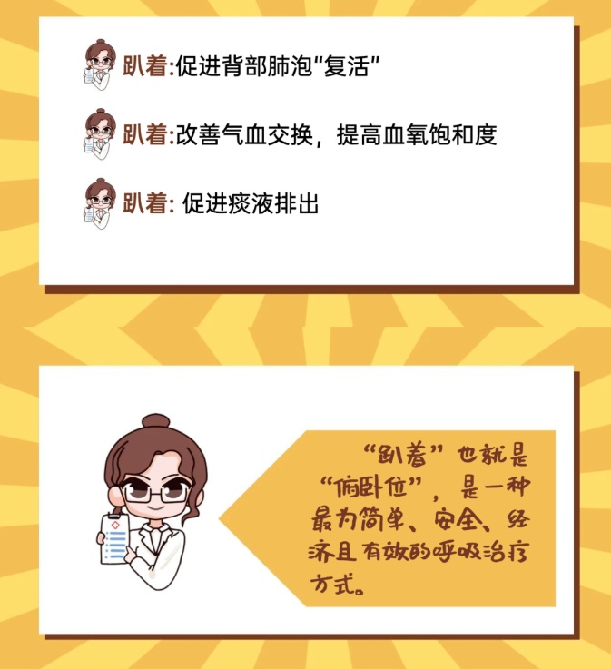 俯卧位通气也就是“趴着”治病,利用翻身床、翻身器或者人工徒手进行翻身,使患者在俯卧位状态下进行呼吸或机械通气,可有效改善患者血氧饱和度,也能有效改善肺通气/血流比例,使背侧萎陷的肺泡复张,肺及气管的分泌物在重力作用下也能得到良好的引流,并且能减少心脏和纵膈对下垂肺区的压迫。