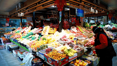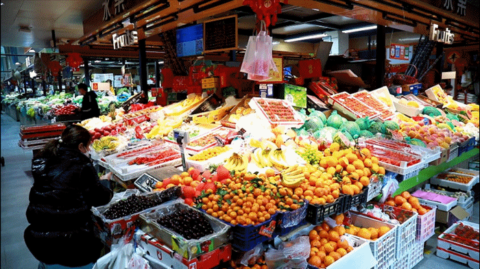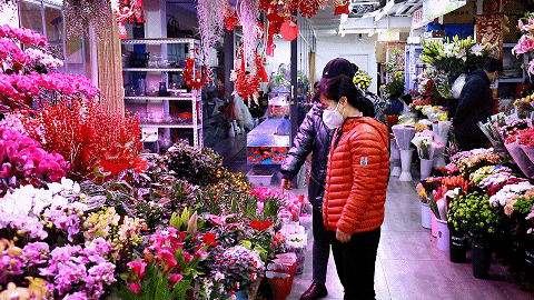 寓意吉祥如意的春联、品质精美的食材,顾客在摊位间穿梭,选购心仪的年货。郁金香等寓意祝福喜庆的鲜花被人们捧回家中,人间烟火气在这一方天地愈显浓郁。
