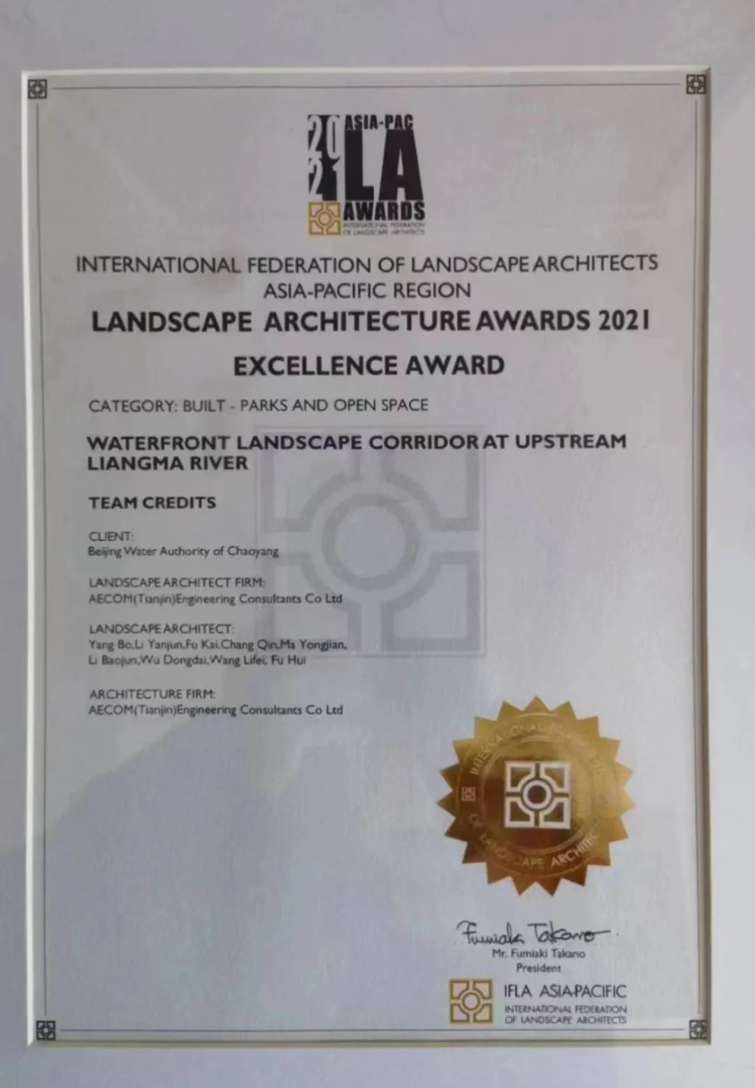 不知您是否记得,国际风景园林师联合会(IFLA)公布了2021年亚太地区风景园林专业奖(IFLA ASIA-PAC LA AWARDS 2021)获奖名单,亮马河上游滨水景观廊道项目荣获公园与开放空间类优秀奖。近日,这项充满荣誉的奖状朝阳拿到手啦!先来一睹为快。