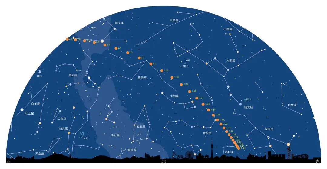 2月里,彗星从鹿豹座经御夫座进入金牛座。2月2日过近地点时,彗星亮度达到最亮,预报亮度在5等多,移动速度最快,一天内在天上的运行路径长达7度多。要知道,月亮平均每天在天也就移动13度多。过近地点后,彗星逐日向南迅速移动,亮度开始下降。