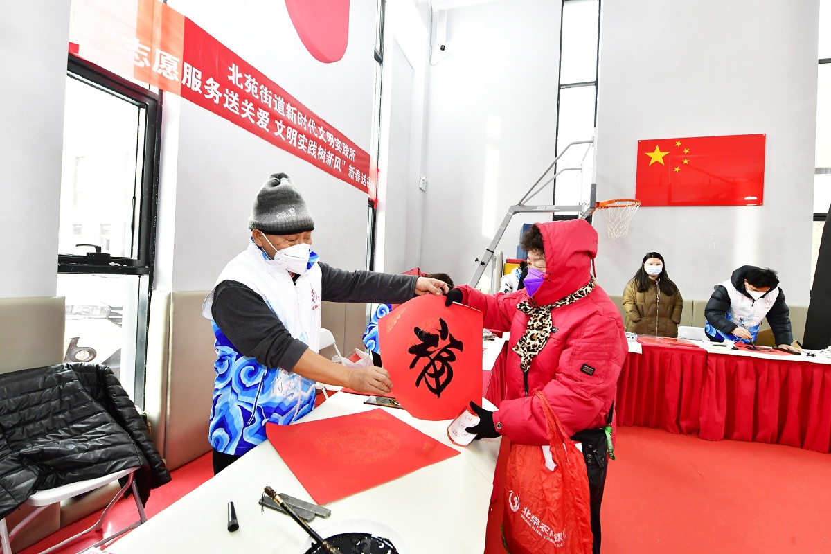 “文明市集”上,志愿者为居民送上“福”字。记者 唐建/摄