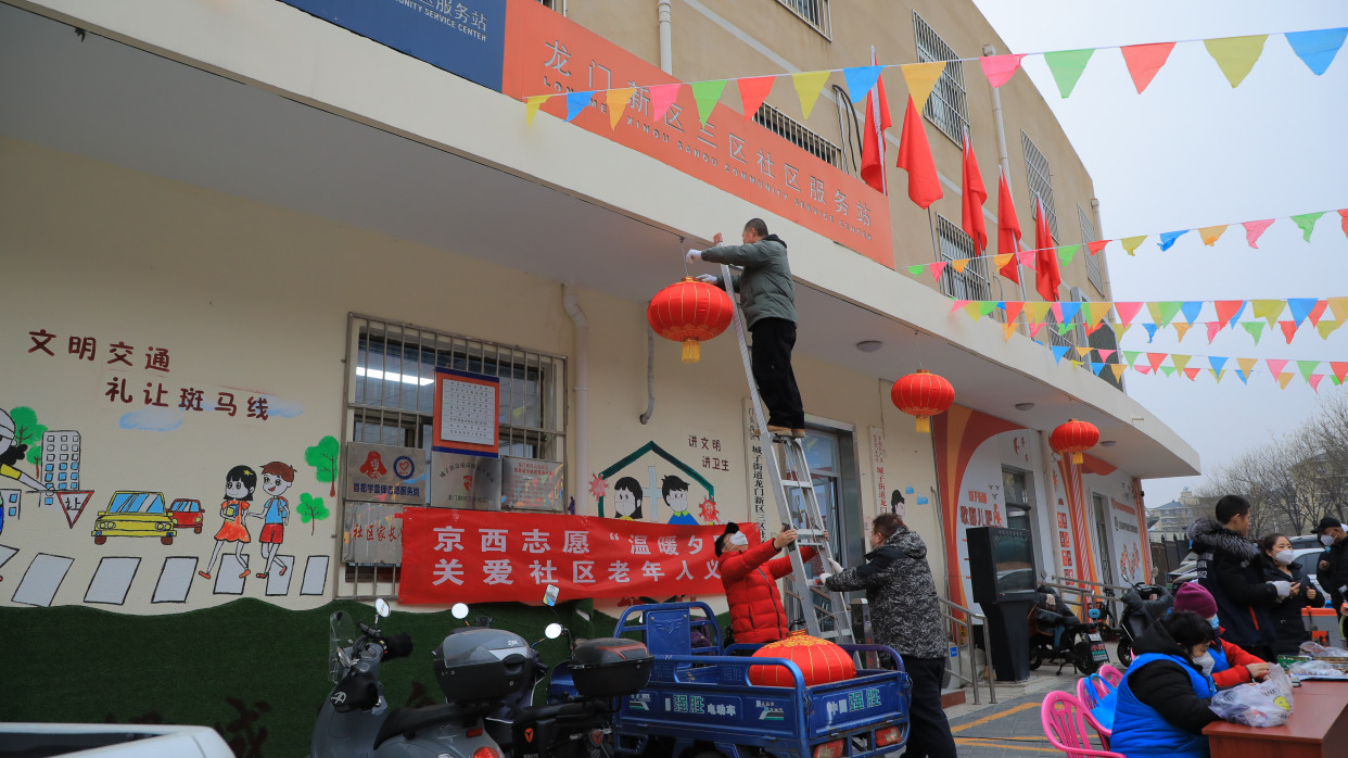 龙门新区三区社区工作人员庞俊介绍说:“这几天我们给社区70个楼门都挂了灯笼,把小区围墙也插了彩旗。新一年,我们还会依托新时代文明实践站,多组织开展一些便民的活动,更好地为居民服务。”
