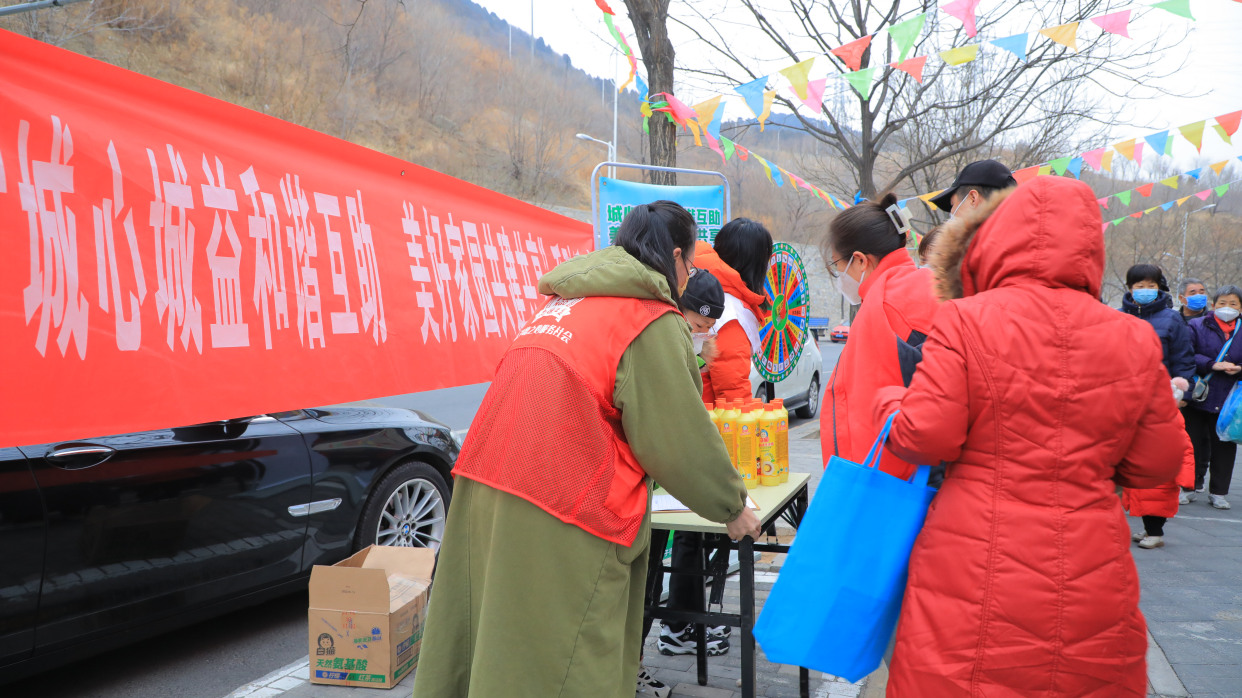 社区居民告诉记者:“居委会门口挂了彩旗,单元门口也挂了红灯笼,过年的氛围一下就来了。今天又赶上大集,我过来磨磨刀,这样春节做饭就好用多了。”