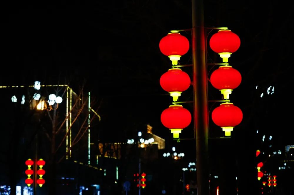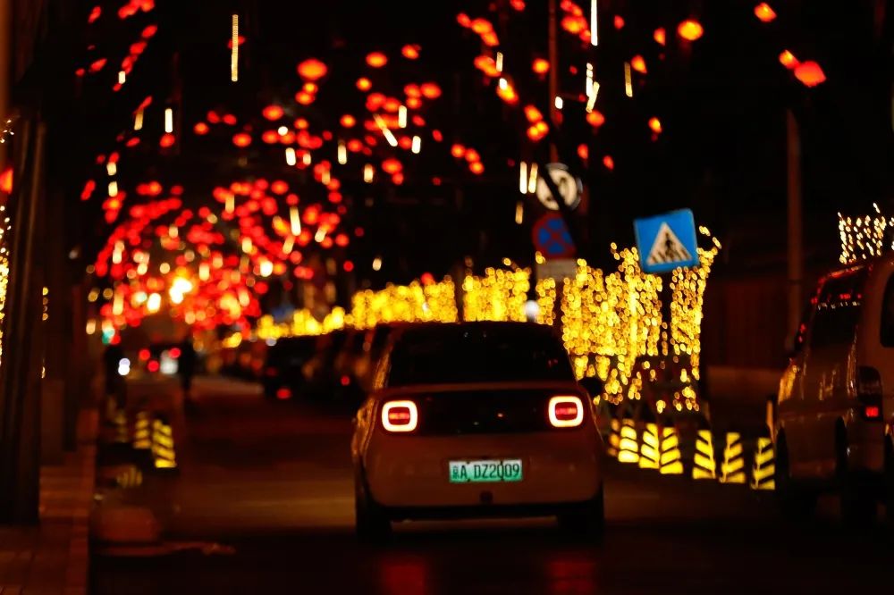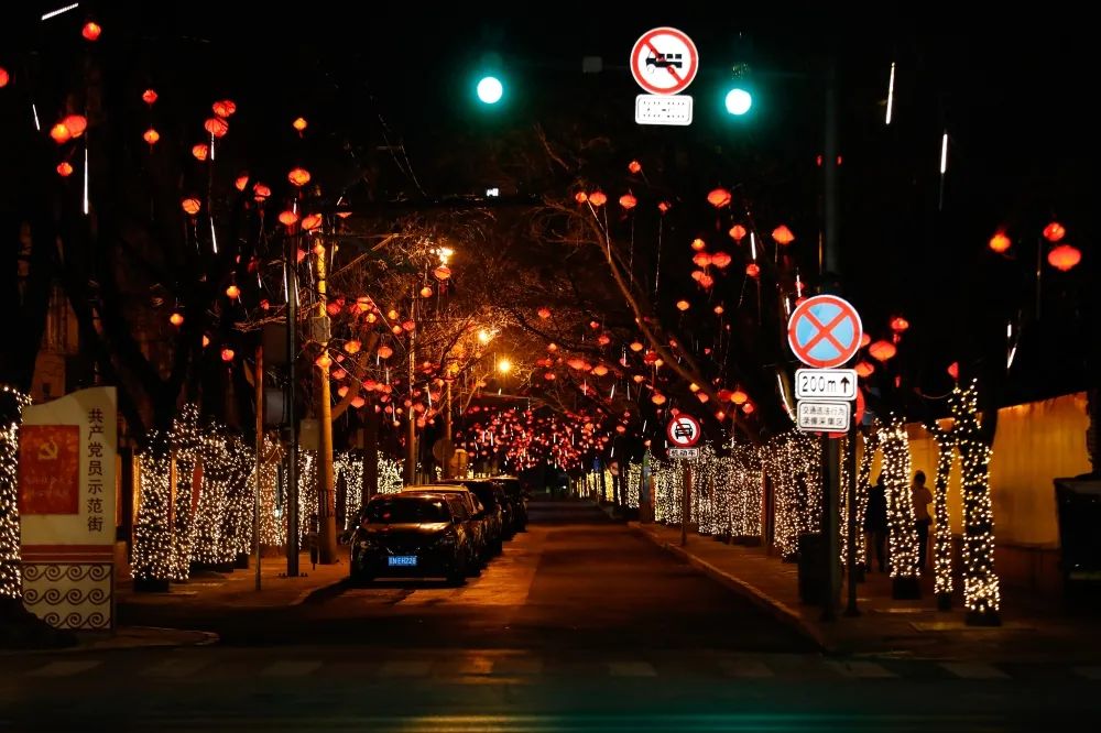 随着夜幕降临,红彤彤的灯笼映照出浓郁的喜庆,闪烁的彩灯如同繁星点点营造出一片祥和,将夜晚的背街小巷装点得分外绚丽。