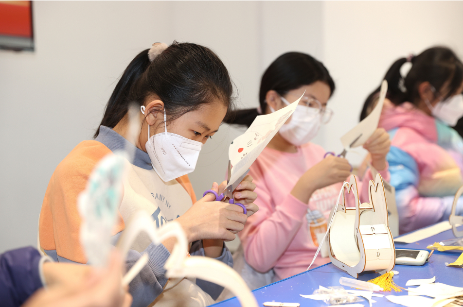 孩子们一来便直奔手工制作室,领取手工材料后,便开始制作起属于自己的白兔灯笼。在工作人员和视频教学的指导下,今年上小学六年级的刘艺佳很快把兔子灯笼的框架拼装好,并帮坐在一旁的弟弟剪着小兔的轮廓。“弟弟年纪比较小,不太会做手工,我就多帮帮他,爸爸在外面做操呢。”刘艺佳所说的“做操”,是此次春节活动的“健身大拜年”环节。