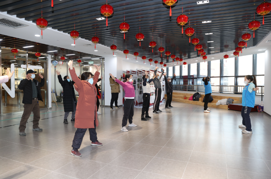 “将我们的胯往前顶,从左边方向转四分之三圈……”将视线转向门口的活动区域,8位居民正在专业武术运动员的带领下,认真地练着名为“八段锦”的中国传统健身功法,一比一划颇有招式。“我就练这一小会,身上已经感觉发热冒汗了。过年在家,我打算每天都练一遍,强身健体。”居民冯女士说。