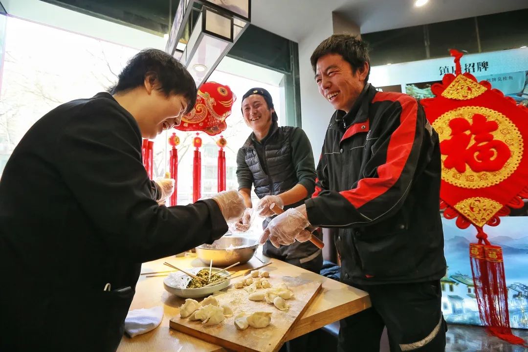 现场,大家一起和面、拌馅、擀皮,按照南北方特色包出了各种花式饺子。一位快递小哥小心翼翼地捧着一个元宝饺子说:“南方人讲究捏饺子,北方人是挤饺子。以前在家过年的时候,母亲就给我们捏这种元宝饺,说是象征着一年都顺顺利利、财源滚滚。今天我也捏几个,愿新的一年我们都万事如意。”