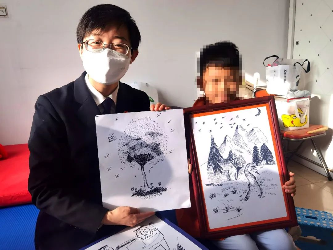 此前,在社会观护报告中,刘曼宜了解到小磊喜欢画画、拼乐高。这次回访,她也特地给孩子带了一套彩笔和乐高模型。令刘曼宜倍感欣慰的是,如今的小磊已然成为了一个活泼开朗的孩子。他不仅热情地招呼客人进屋入座,兴高采烈地说起自己担任了学校的广播员,还现场展示了自己的绘画作品。临别之际,他更是回赠给刘曼宜一幅自己的新画作,祝福她春节快乐。