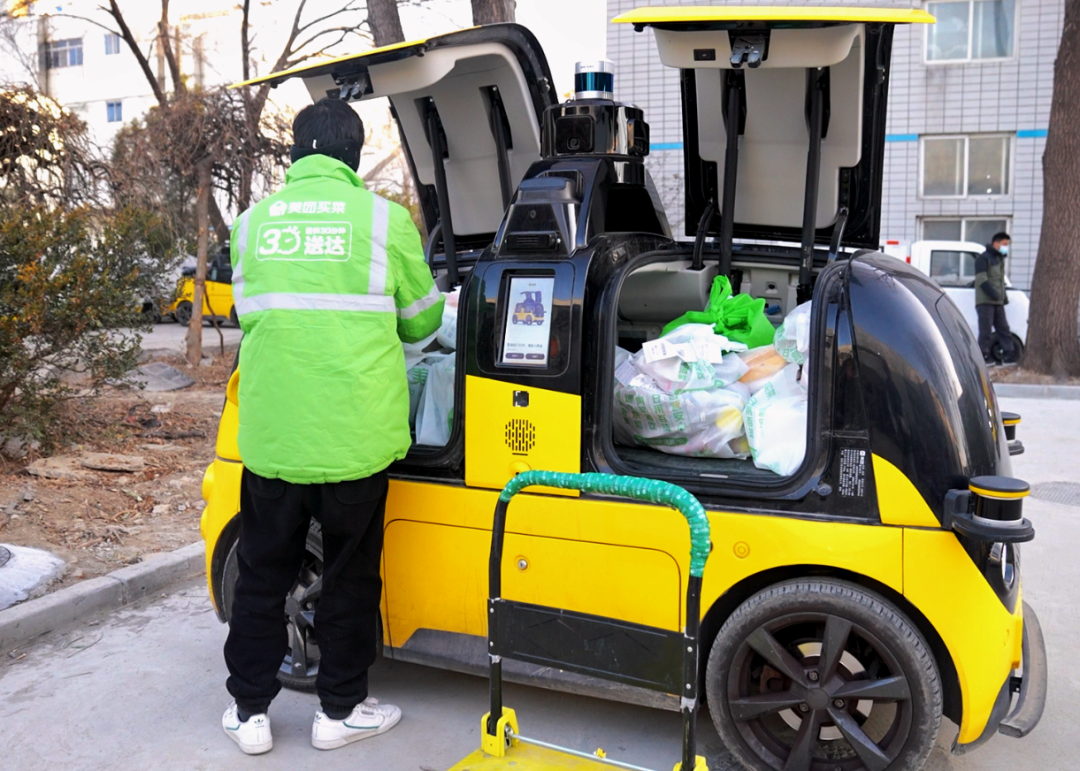 在顺义街头,一辆辆忙碌的小黄车不时驶过,骑手+自动配送车的组合成为春节期间一道风景线。这是美团在顺义常态化试运行的自动配送车,为美团买菜后沙峪站点附近居民配送生鲜食杂。