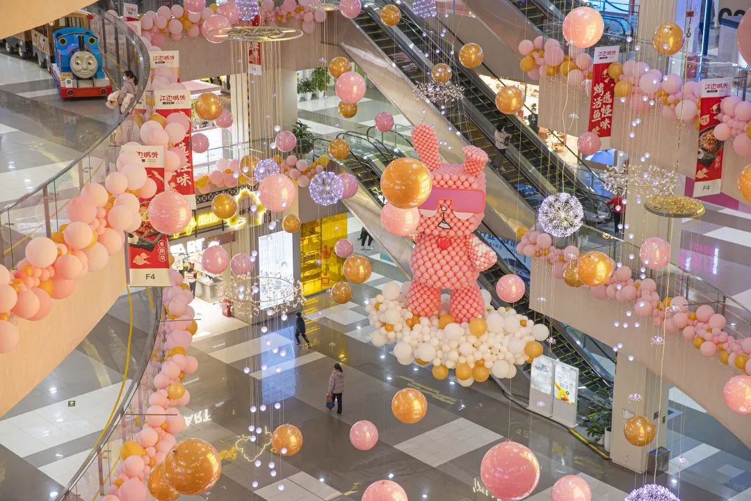 商场里,巨型兔子装饰吸引了不少小朋友和大朋友的注意,纷纷拍照打卡记录。