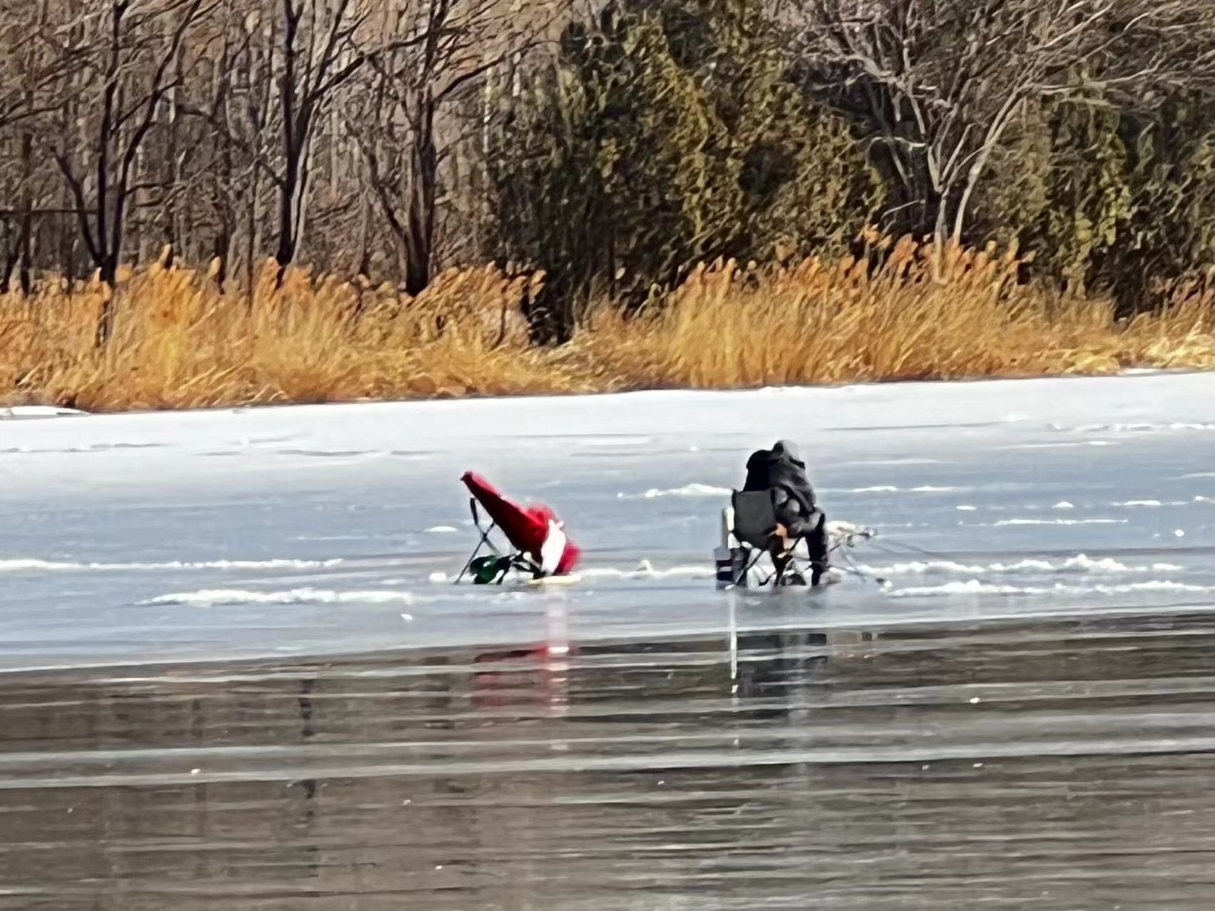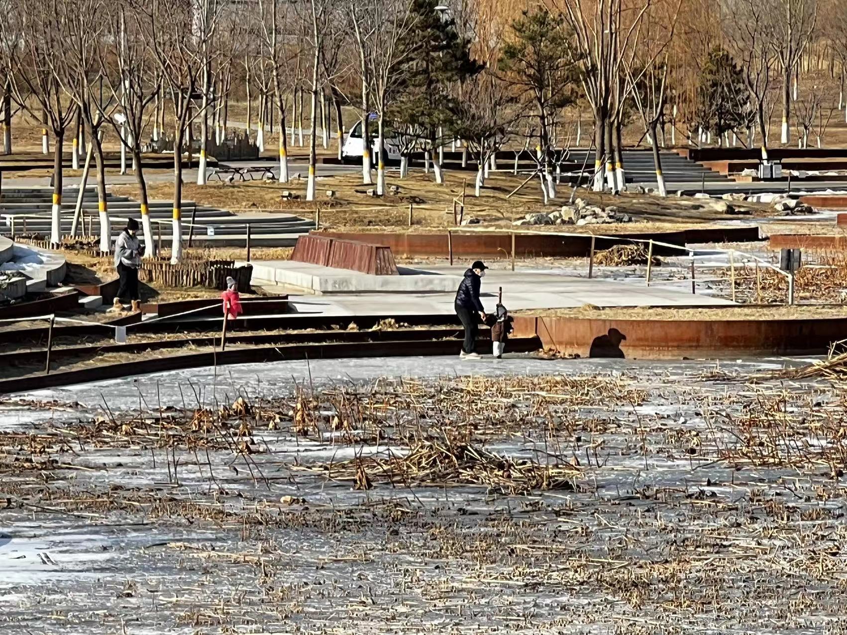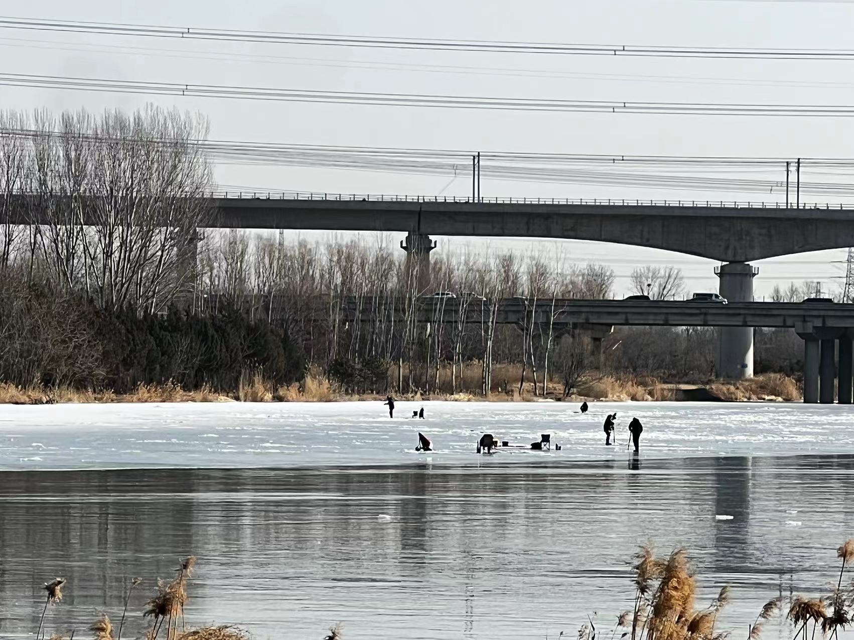 此外,滨水公园附近的温榆河俨然也成为了一处天然冰场,五六个人在冰面上凿出冰洞,坐在小凳子上钓鱼。记者在现场看到,冰面已经有开化的痕迹,附近的一个桥洞下面,有大片冰面已经融化,河水在静静流动,十分危险。