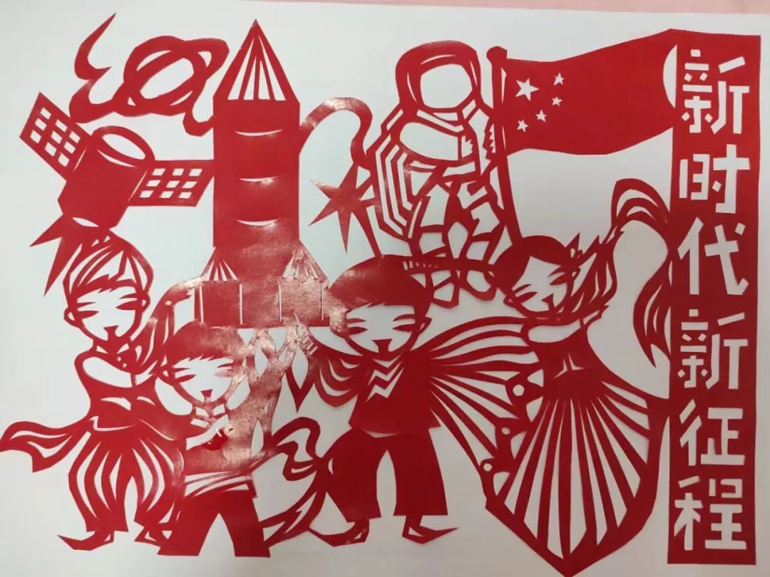 在这幅剪纸作品中,徐梓涵将传统艺术与航天科技、民族团结等元素融为一体,以“新时代新征程”为主题进行创作,讴歌了党的十八大以来全国人民在党中央的领导下锐意进取,攻坚克难,所取得的伟大历史成就。