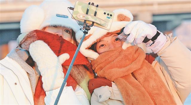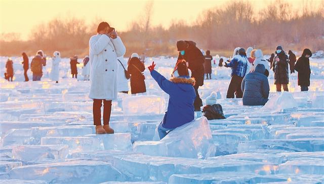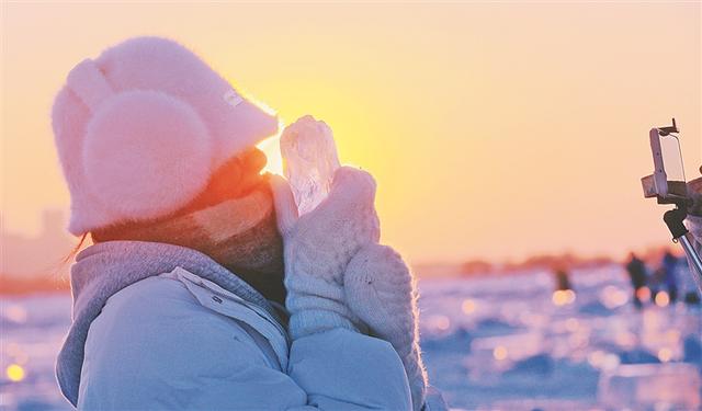 来自浙江的几位游客,在逛完冰雪大世界等景点后,特意约车赶到这里打卡。从未看到如此大的天然冰块的他们,在近-30℃的寒冷中,在冰块上变换各种姿势拍照,甚至趴在冰上。对冰天雪地倍感新奇的心态,使他们暂时忘却了寒冷。