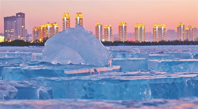 采出来不用的残冰,大大小小堆在岸边与江面上,连绵着铺出一两公里,阳光照耀下,一块块晶莹剔透,这里被南方游人誉为“钻石海”。