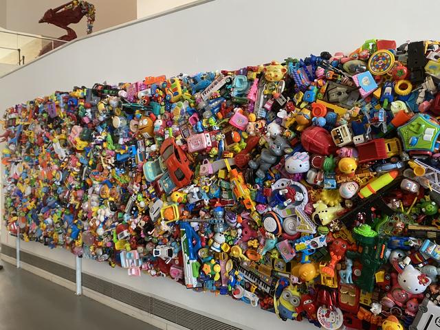一走进美术馆的大厅,队员们就被一面奇特的“墙”所吸引。这面由各种废弃的塑料玩具组成的“墙”,其实是一件装置艺术品,名字叫《景观墙》。在《景观墙》的左上方,一只鹈鹕妈妈正在给小鹈鹕喂食,那流向待哺小鸟的食物,都是作者从长江入海口打捞上来的废弃玩具。这件作品告诉大家,废弃不用的玩具不要乱扔,否则会伤害动物们。队员们为艺术作品所体现出的生态环保理念所折服,纷纷表示,自己也要做环保小卫士。