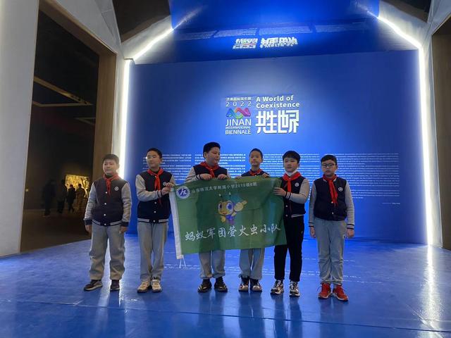 2月3日,山师附小五(8)中队萤火虫小队走进山东省美术馆,参观了“共生世界——2022济南国际双年展”。