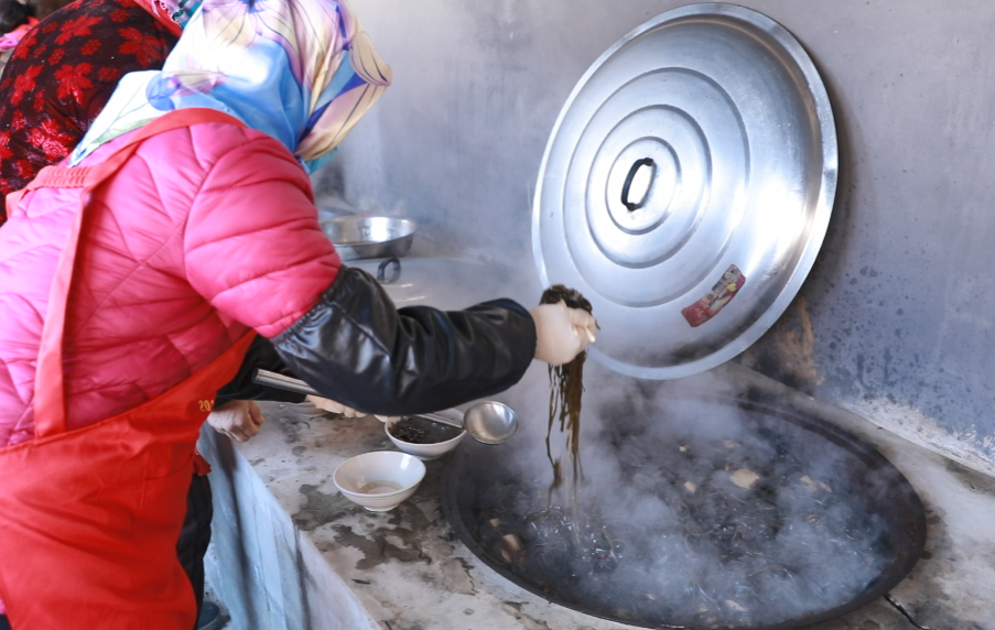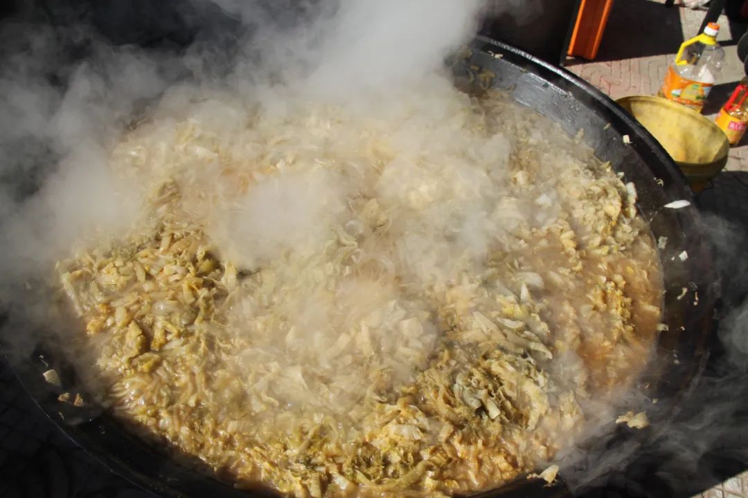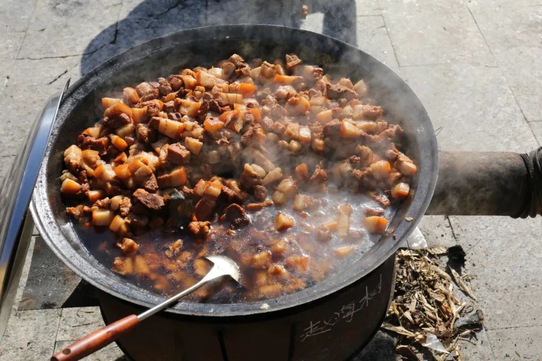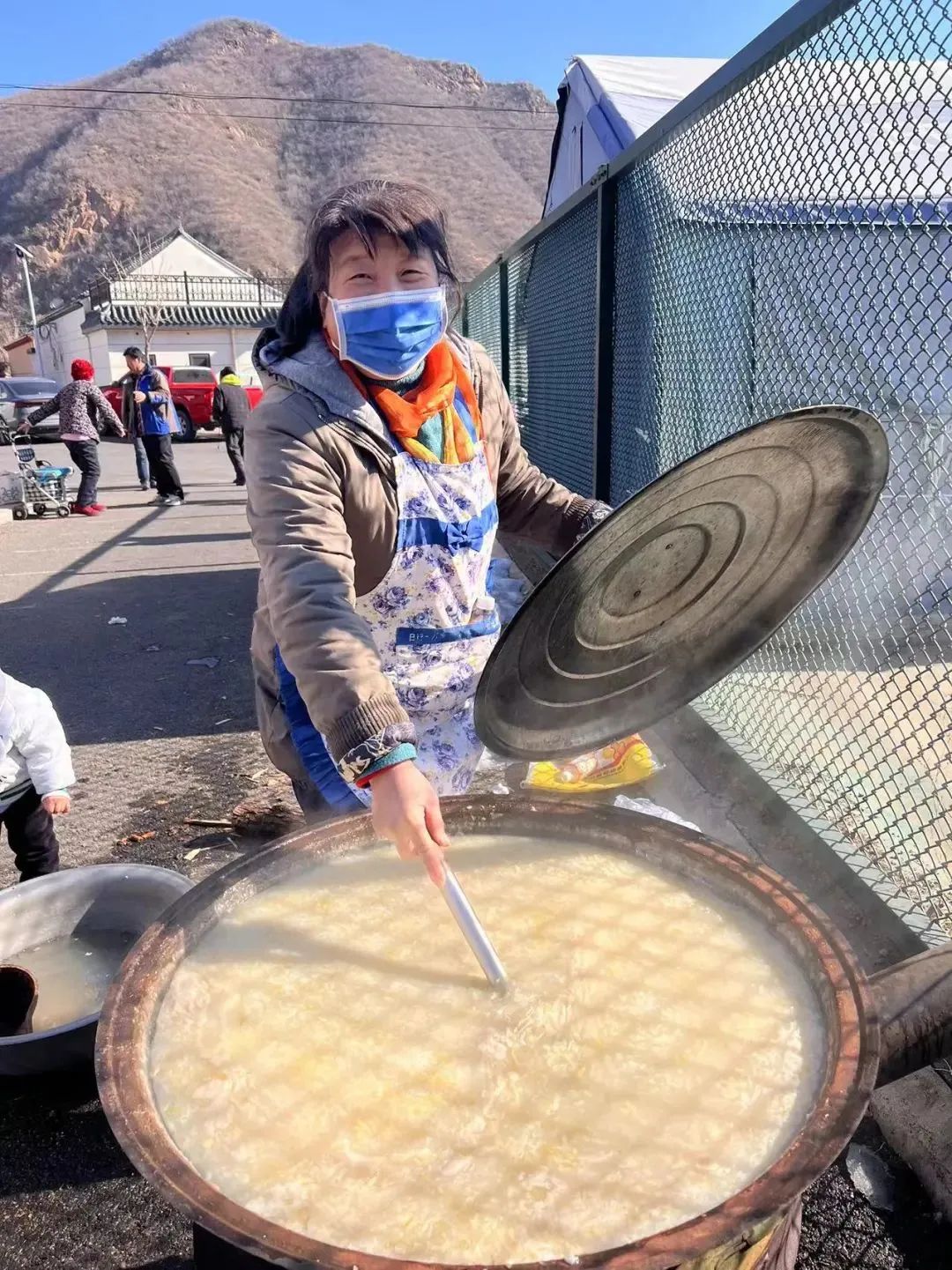 村民们自发组织,多口大锅齐开火,木柴的大火苗舔着锅底,锅里的粘粥、猪肉、粉条、海带、白菜、豆腐咕嘟咕嘟冒着热气