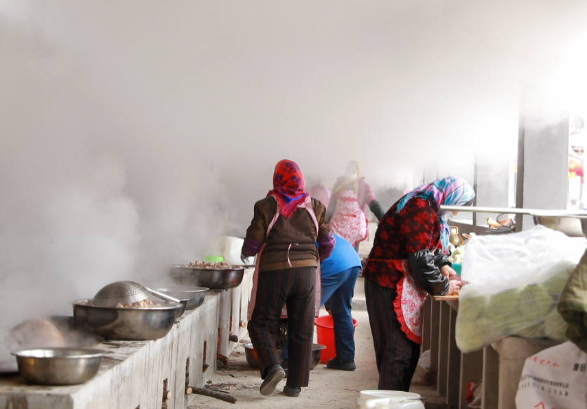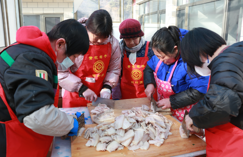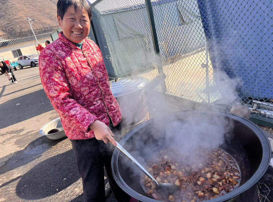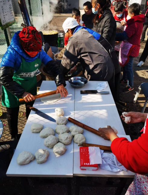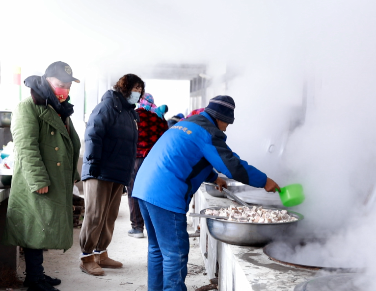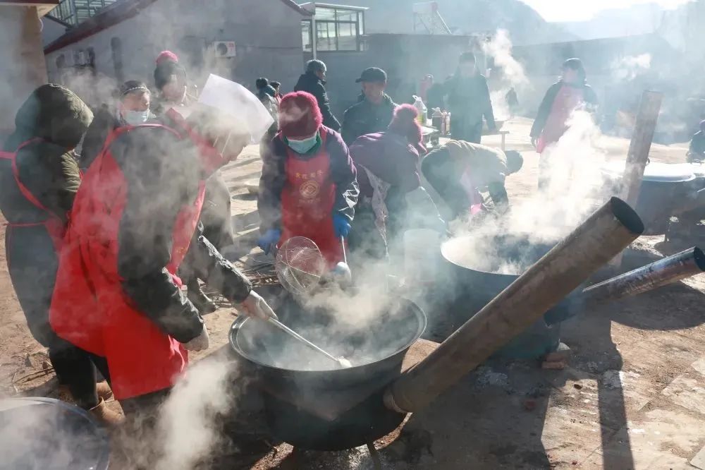 咱们再看汤河口镇,立春一过,山里的早晨虽然寒冷,但仍抵挡不住村民们的热情,黄花甸子、小梁前、古石沟门等村五百余名群众忙活了起来,村里的巧妇、“大厨”们纷纷行动起来,架锅、烧火、切菜、炖肉、蒸红豆饭,开始准备当天的“敛巧饭”,袅袅炊烟萦绕在山村的上空。