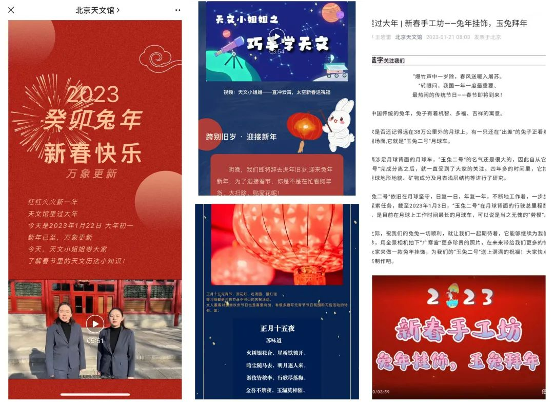 除线下活动外,线上活动同样精彩。新春手工坊上新,带大家制作兔年挂饰,一起探访“玉兔二号”;天文小姐姐系列视频上线,让大家跟随镜头,了解中国古代历法那些事;更有线上灯谜大挑战,直接将年味拉满。形式新颖,趣味满满,累计2.3万余人次参与,获得一致好评。