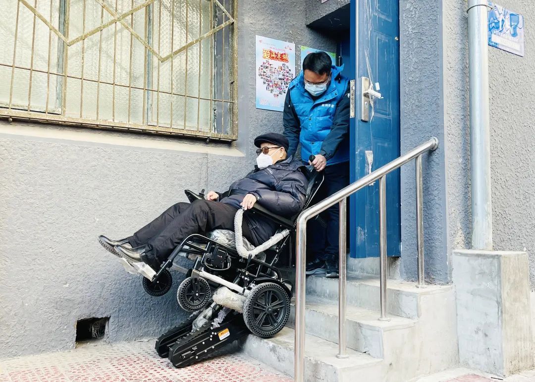 胜利街道站前北街社区工作人员使用爬楼机协助老人上楼。