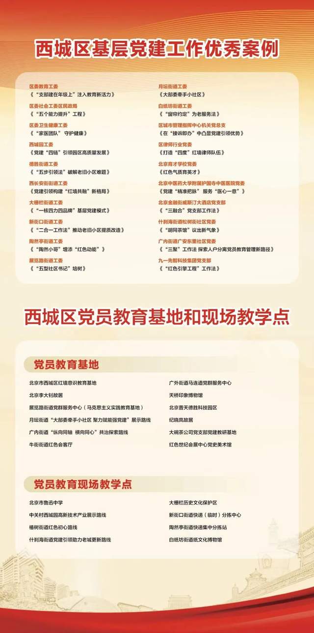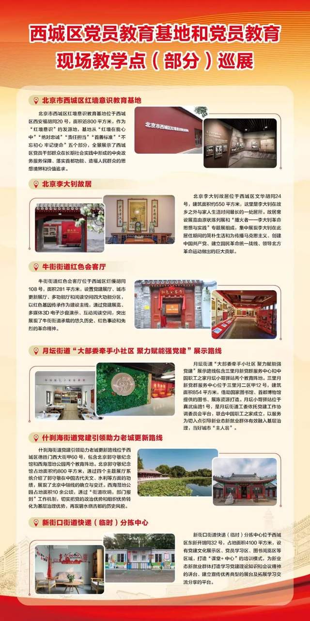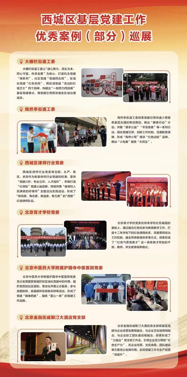 此次展览用图文并茂的形式生动呈现了“陶然小哥”“红律助”“红色气质育英才”、大栅栏街道“党建四合院”等西城区基层党建工作优秀案例,宣介了西城区红墙意识教育基地、李大钊故居、牛街街道红色会客厅、月坛街道“大部委牵手小社区 聚力赋能强党建”展示路线、什刹海街道党建引领助力老城更新路线、新街口街道快递(临时)分拣中心等党员教育基地(现场教学点)。展览用鲜活的图文语言、极具地区特色的内容与过往市民形成良好互动,以开放姿态欢迎南来北往的旅客前往西城区各个党群服务阵地“打卡”。