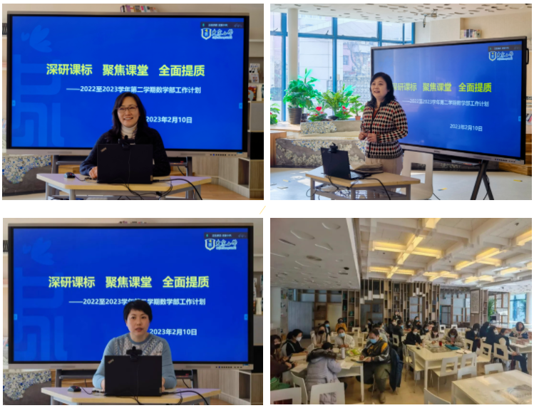 围绕《深研课标 聚焦课堂 全面提质》,数学部全体老师在丁雁玲副校长的主持下开展了新学期工作计划部署会,韩巧玲副校长莅临参加。李冉主任将新学期重点工作从学习、教研、课堂、评价四个维度进行了全面细致的部署。丁校长嘱咐老师们新学期要以“实干”精神踏实工作,要 “爱读书、读好书、善读书”,从使命、责任、能力三个方面不断学习与精进。韩巧玲副校长以“回归、质量、常态”三个关键词对老师们新学期的工作提出希望。