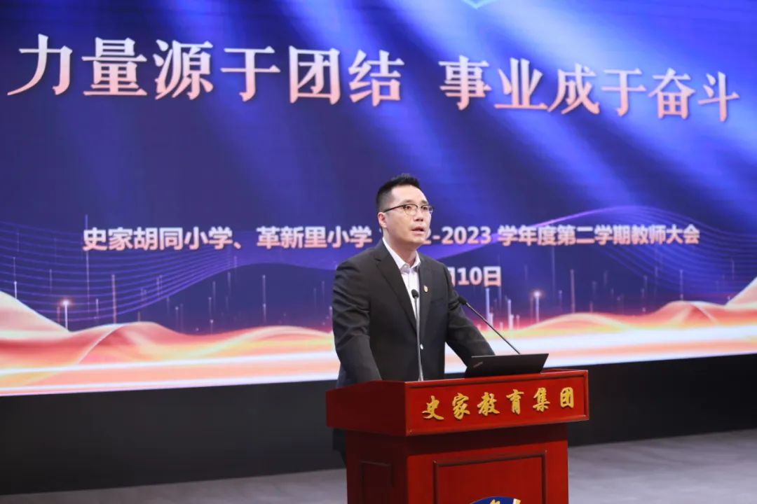 史家教育集团党委书记、集团总校长,史家胡同小学党总支书记、校长,革新里小学校长洪伟在讲话中谈到,全体干部教师要要深入学习贯彻落实党的二十大精神,扎实推进教育现代化建设各项任务,持续推动“双减”工作走深走实,特别是进一步增强集团教育命运共同体的内在聚合度,聚力实现各成员校改革与发展同心、同频、同进。
