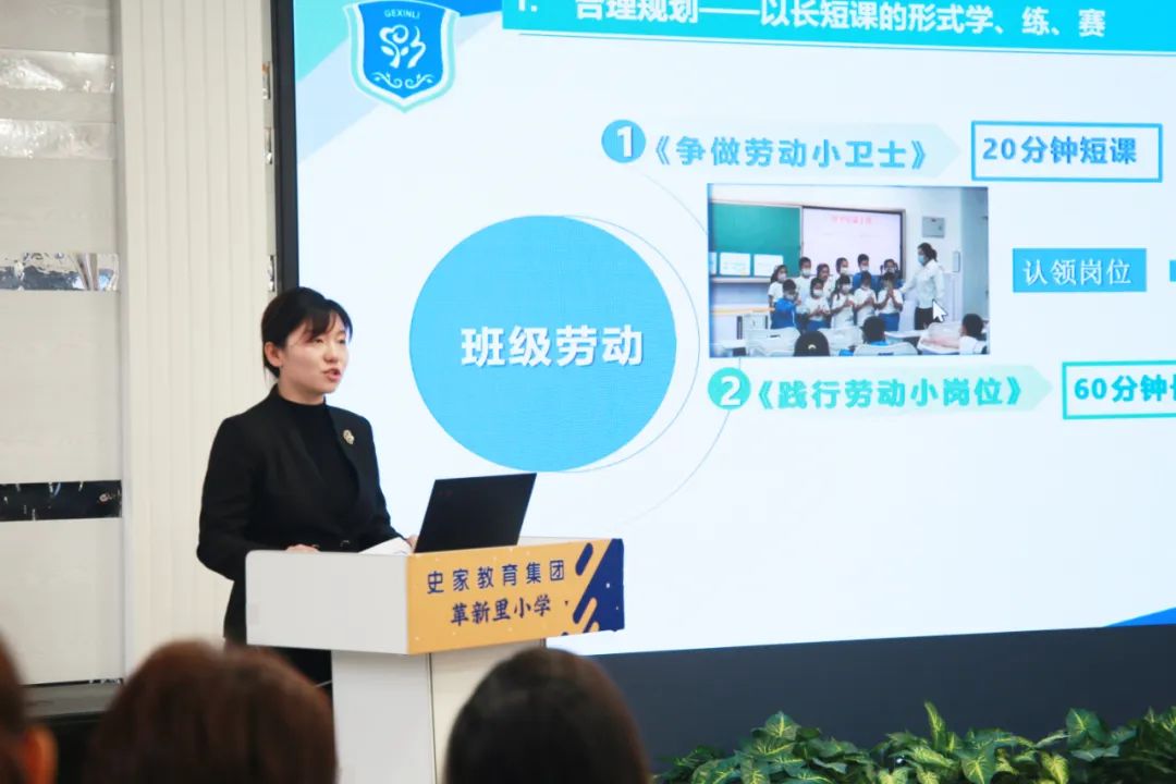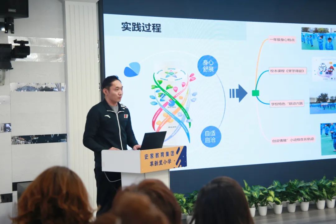 在革新里小学分会场上,革新里小学周育副校长带领教师团队分享了学校的“五彩蔓课程”的实践经验及阶段成果。五彩蔓课程遵循学科自身规律,发挥教师自身优势,以“学科+X”进行课程整合,实现从“课程”走向“课程群”,从“单学科”走向“跨学科”,从“学科教学” 走向“学科育人”的原则。五大课程群间相互交织,为学生的成长打造出网状通道并不断输送养分,这个过程也极大激发着教师革新力的不断产生。