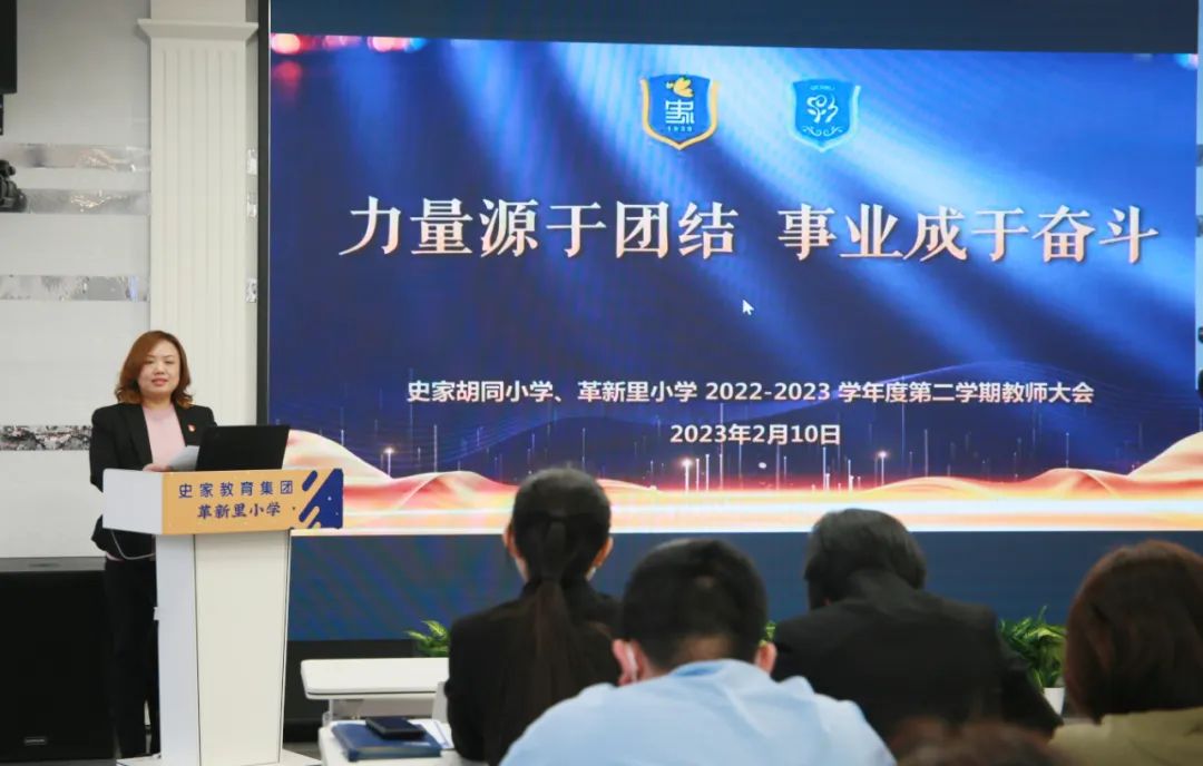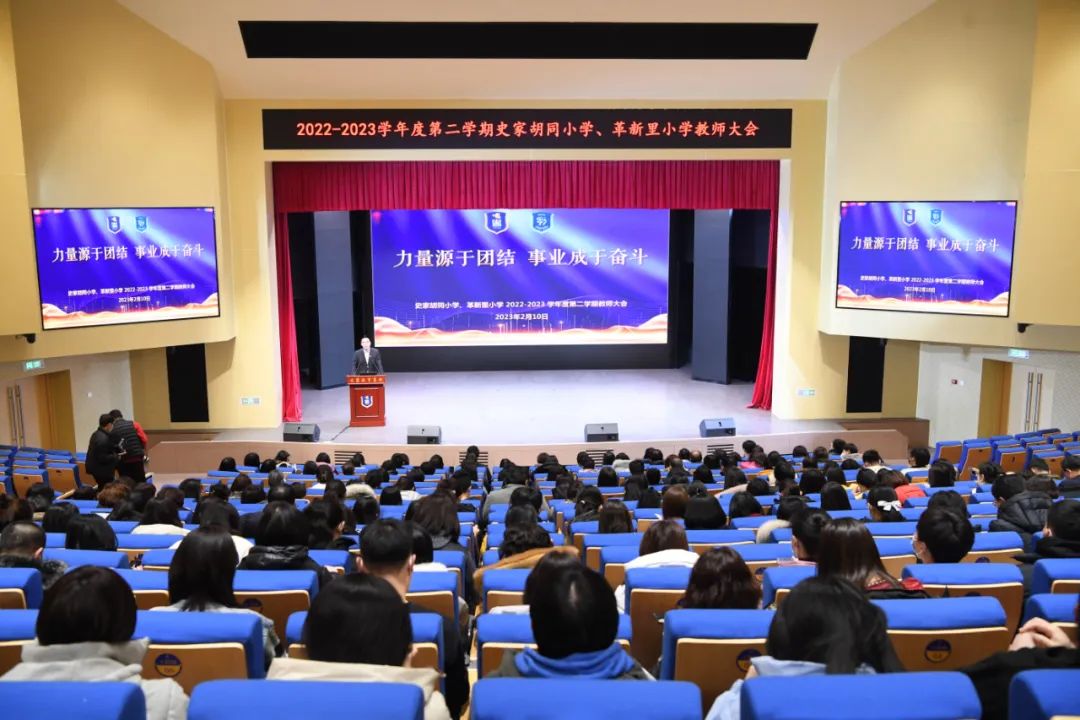 2月10日上午9点半,史家胡同小学、革新里小学全体干部教师齐聚一堂,举行主题为“力量源于团结 事业成于奋斗”新学期教师大会。史家胡同小学党总支副书记张怡传达区级讲话精神。教师发展中心崔旸副校长主持本次活动。